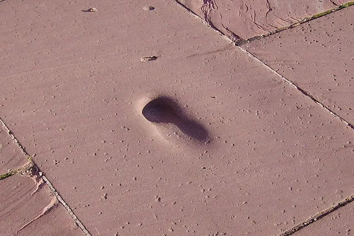 Ansicht eines schuhförmigen Abdrucks auf einem Pflasterstein des Großen Altans